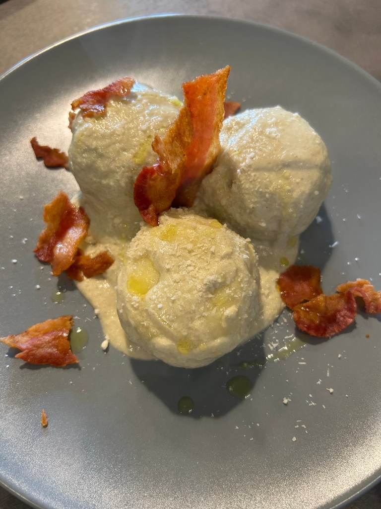 In una padella ho messo le fettine di bacon fino a doratura poi le ho asciugate su carta da cucina, devono rimanere croccanti, impiatto gli gnocchi con la salsa e sbriciolo il bacon un pizzico di grana e un filo di olio extravergine