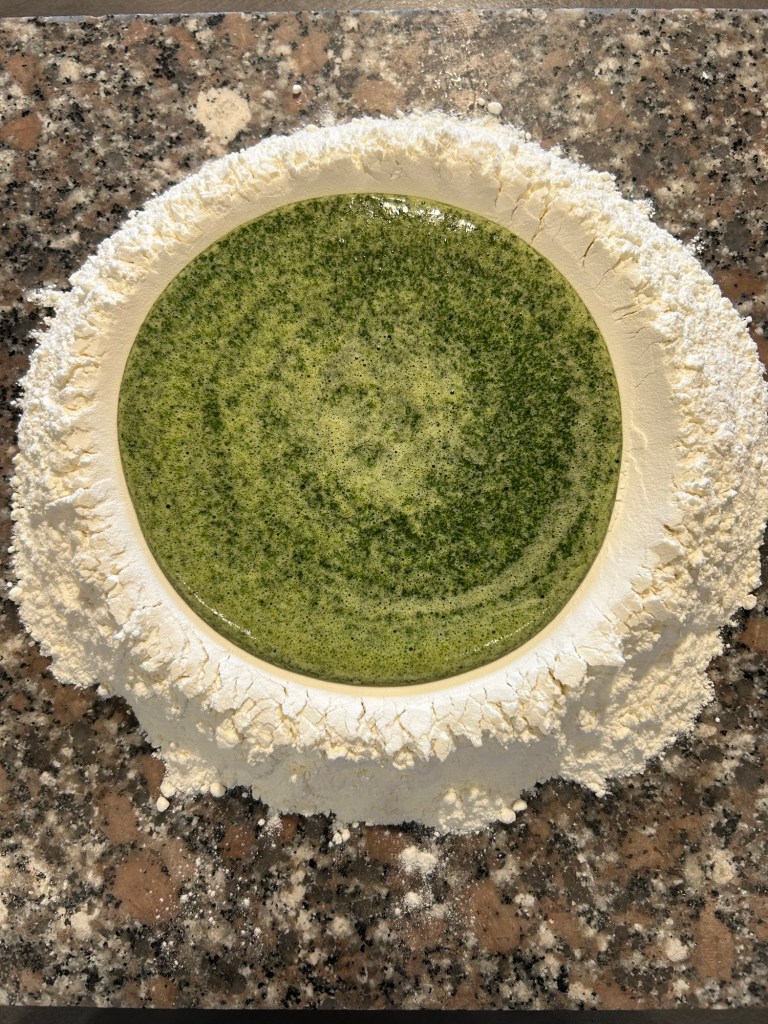 Metto la farina sulla spianatoia, formo un incavo e metto le uova che ho frullato con gli spinaci precedentemente lessati e strizzati