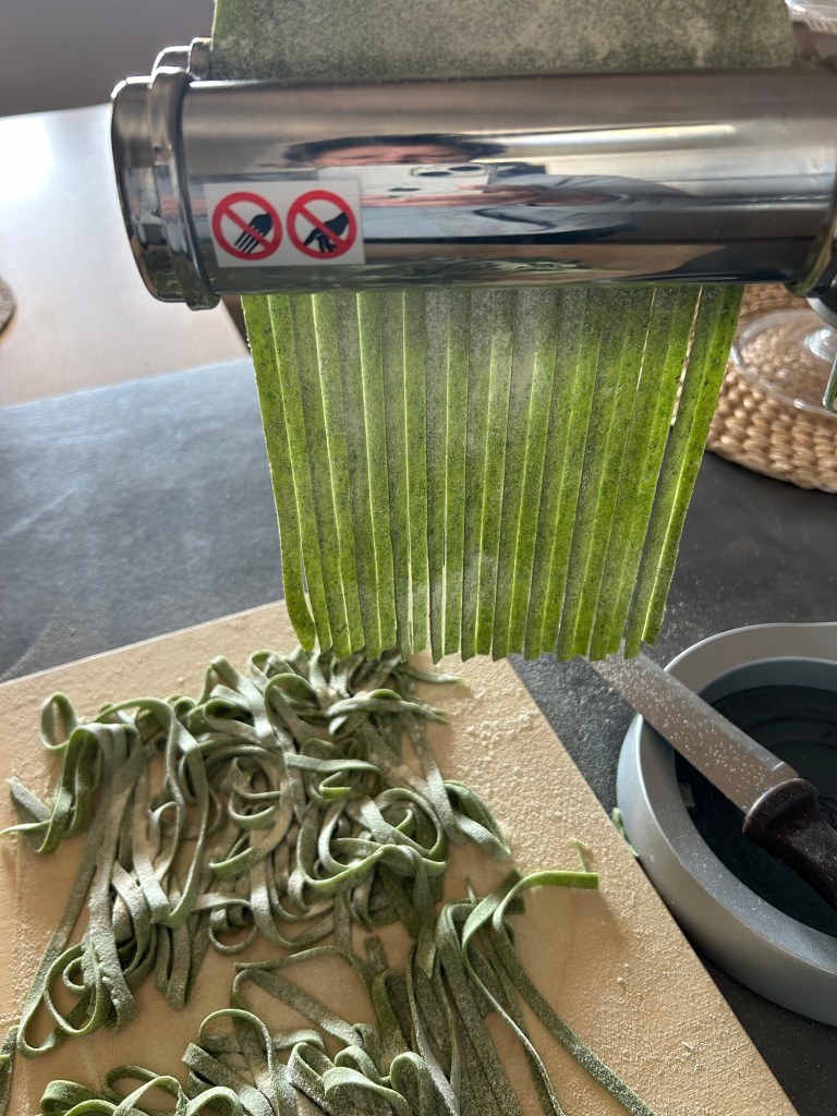 Inserisco il rullo delle tagliatelle, infarino sempre con la semola che assorbe meglio e non appiccica, inserisco le sfoglie, le stendo belle larghe sul piano di tavolo in modo che si asciughino un po’, intanto preparo il sugo
