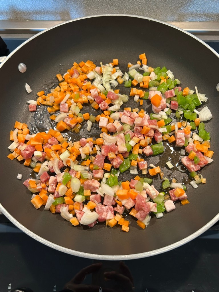 Taglio a cubetti piccolissimi la carota, il sedano, e la cipolla, li aggiungo il una padella con olio e il bacon a dadini e lascio soffriggere