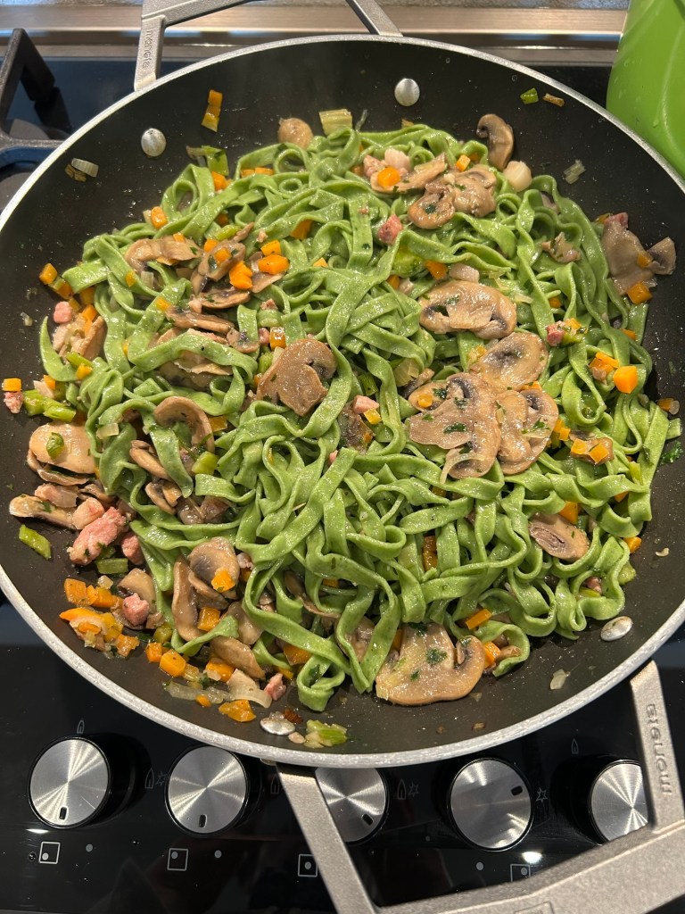Porto a bollore acqua salata e butto le tagliatelle, le tolgo al dente, ci vorranno veramente pochi minuti, il tempo che vengono a galla, le scolo e le aggiungo al condimento mantecando con un filo di olio e se serve qualche cucchiaio di acqua di cottura della pasta, pochi minuti e Impiatto