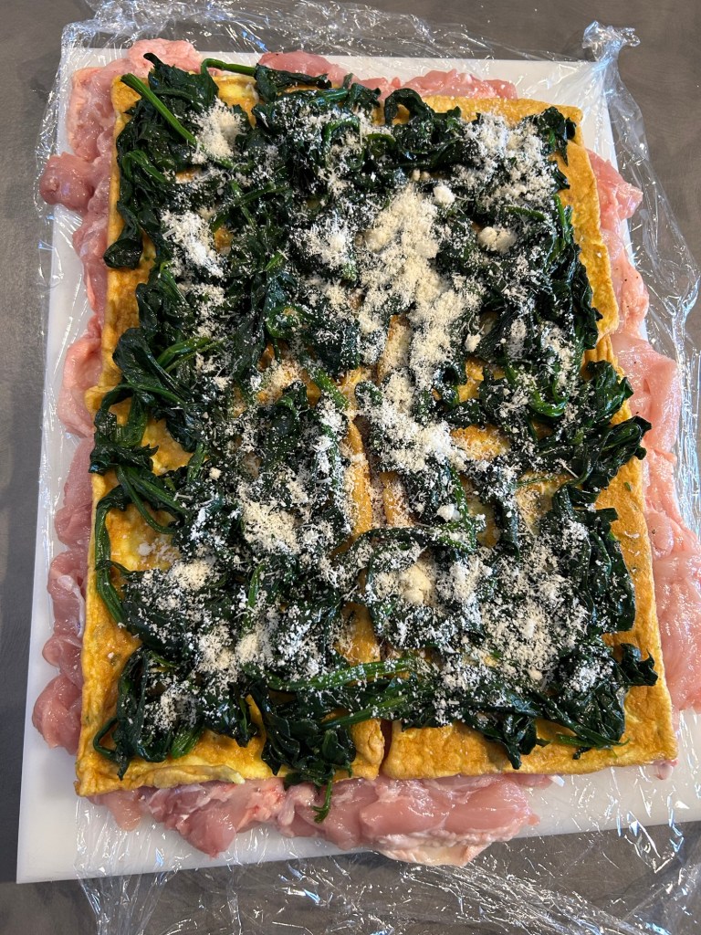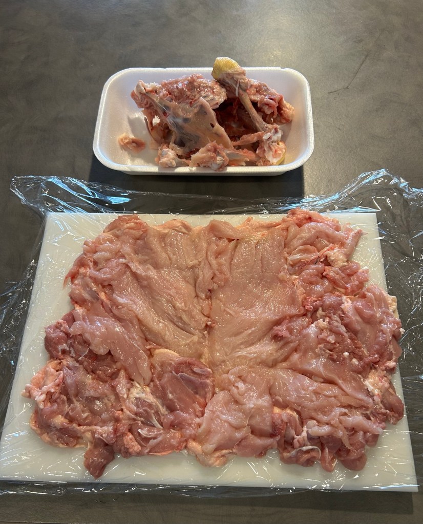 Con un bel coltello affilato ho disossato il pollo, aperto a libro cercando di dare una forma rettangolare, appiattendo e pareggiando bene la carne