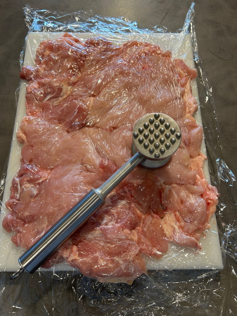 Copro con pellicola e lo batto con il batticarne per avere uno spessore regolare, aggiungo del sale e una macinata di pepe