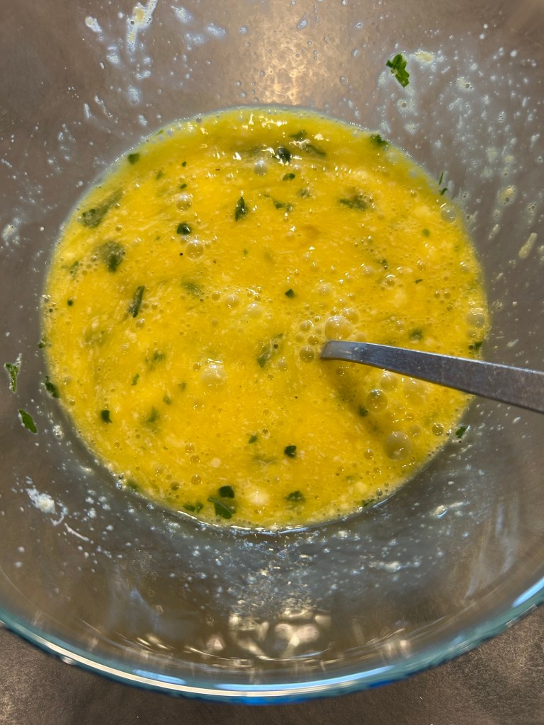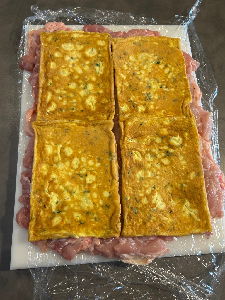 Suddivido l’impasto in 4 parti e cuocio 4 frittatine, ho utilizzato un pentolino quadrato per ricoprire bene tutta la superficie del pollo