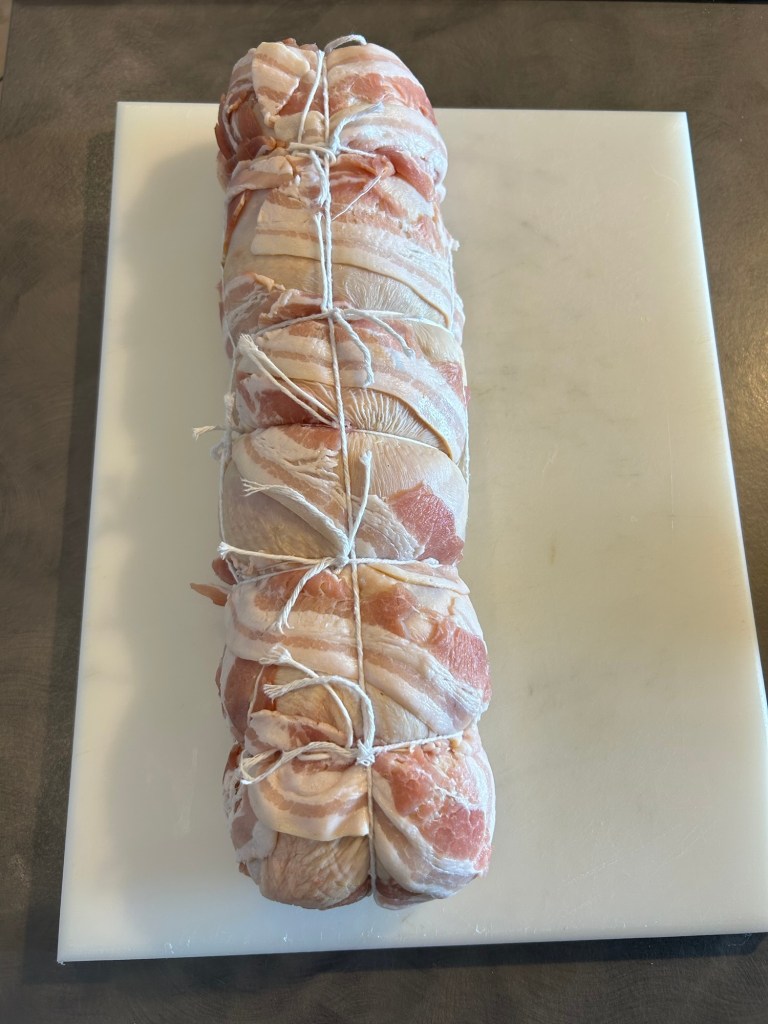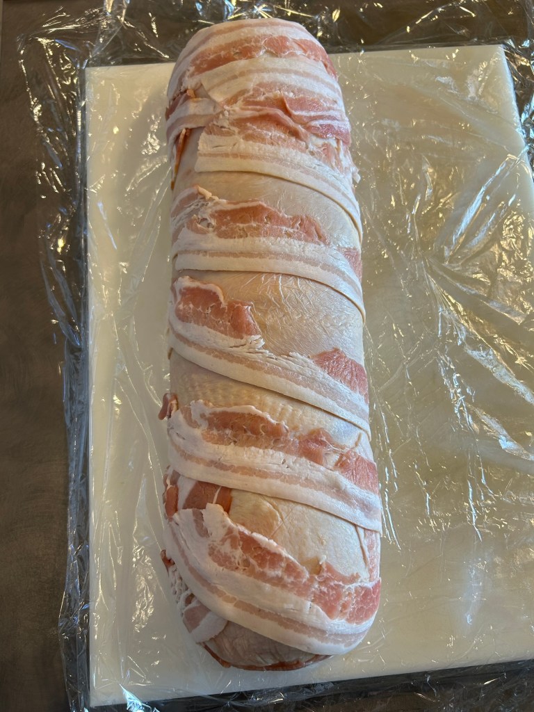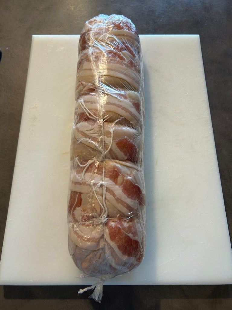 Formo un bel rotolo compatto chiuso alle estremità, avvolgo con fettine di bacon anche sulle estremità
