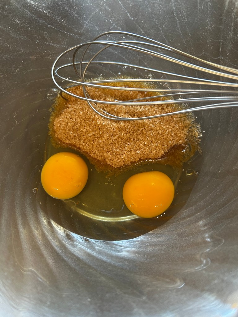 In una ciotola rompo le uova e aggiungo lo zucchero lavoro con la frusta a mano