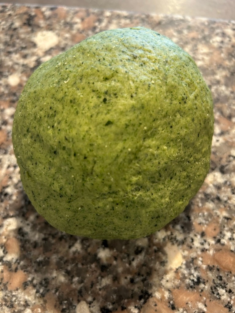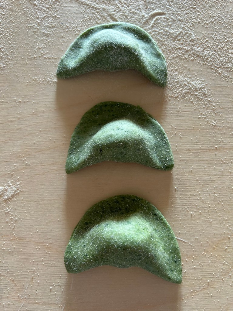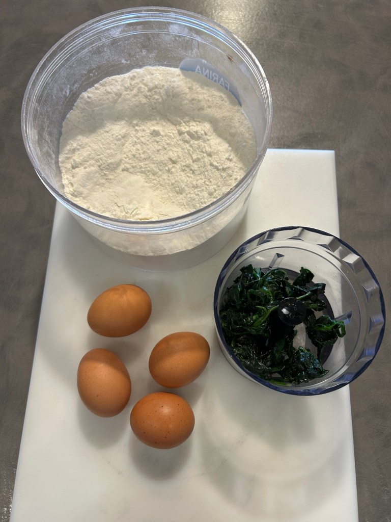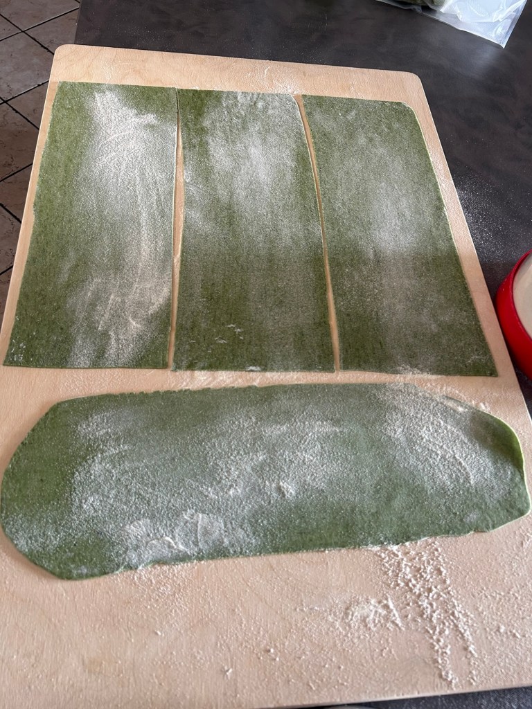 Preparo la sfoglia nella maniera classica, tutti i passaggi li trovate nel blog, comunque metto la farina sulla spianatoia, formo un incavo e metto le uova che ho frullato con gli spinaci precedentemente lessati e strizzati, con una forchetta inserisco pian piano la farina poi lavoro con le mani fino ad ottenere un panetto liscio che lascio riposare almeno mezz’ora avvolto nella pellicola