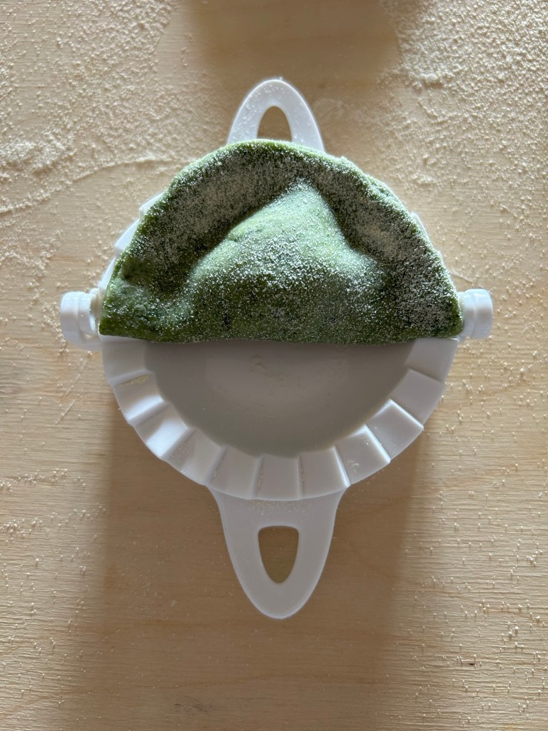 Trasferisco la mezza luna nell’apposito attrezzo e chiudo sigillando per bene, se non lo avete potete utilizzare i rebbi di una forchetta