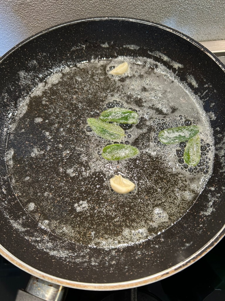 Adesso decidete voi come condirli con un semplice sugo al pomodoro o al burro e salvia, in una padella sciolgo il burro, aggiungo dell’olio extravergine uno spicchio di aglio e alcune foglie di salvia e lascio soffriggere
