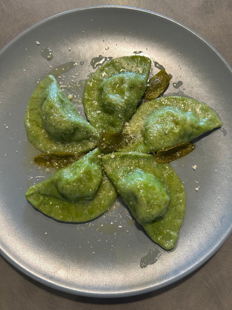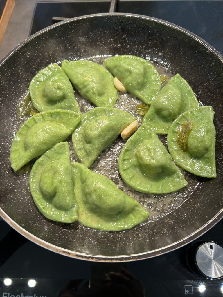 Porto a bollore acqua salata e verso le mezzelune, le lascio bollire per 5/6 minuti poi le scolo e le manteco nel burro e salvia