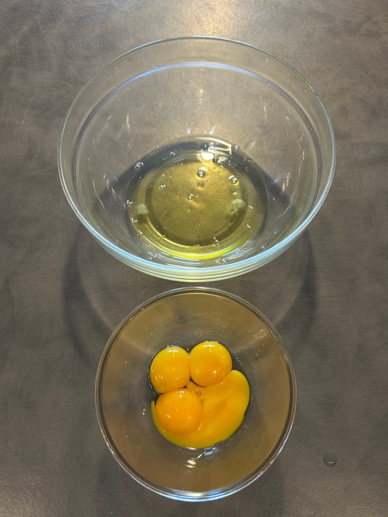 Utilizzo uova a temperatura ambiente, divido gli albumi dai tuorli in due ciotole