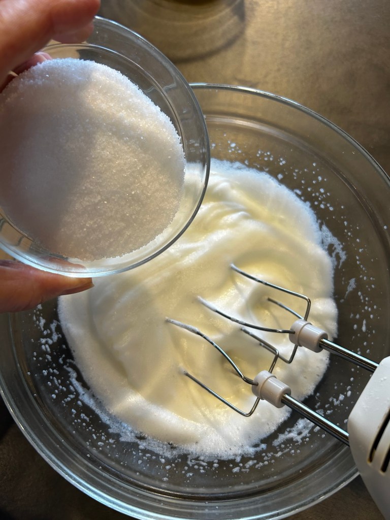 Monto con le fruste e quando iniziano a diventare bianchi aggiungo lo zucchero poco per volta continuando a montare