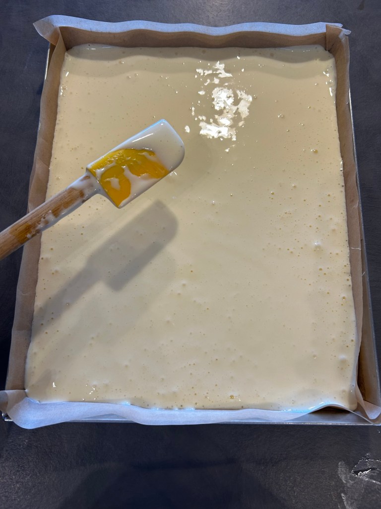 Distribuisco il composto in una teglia che ho rivestito di carta forno e livello