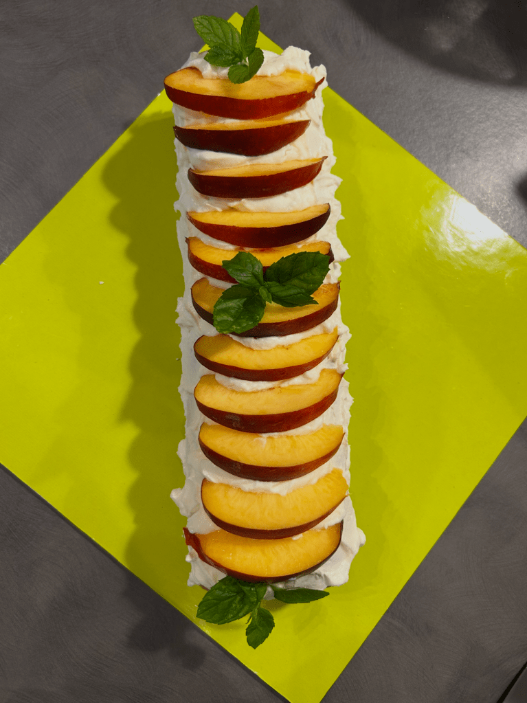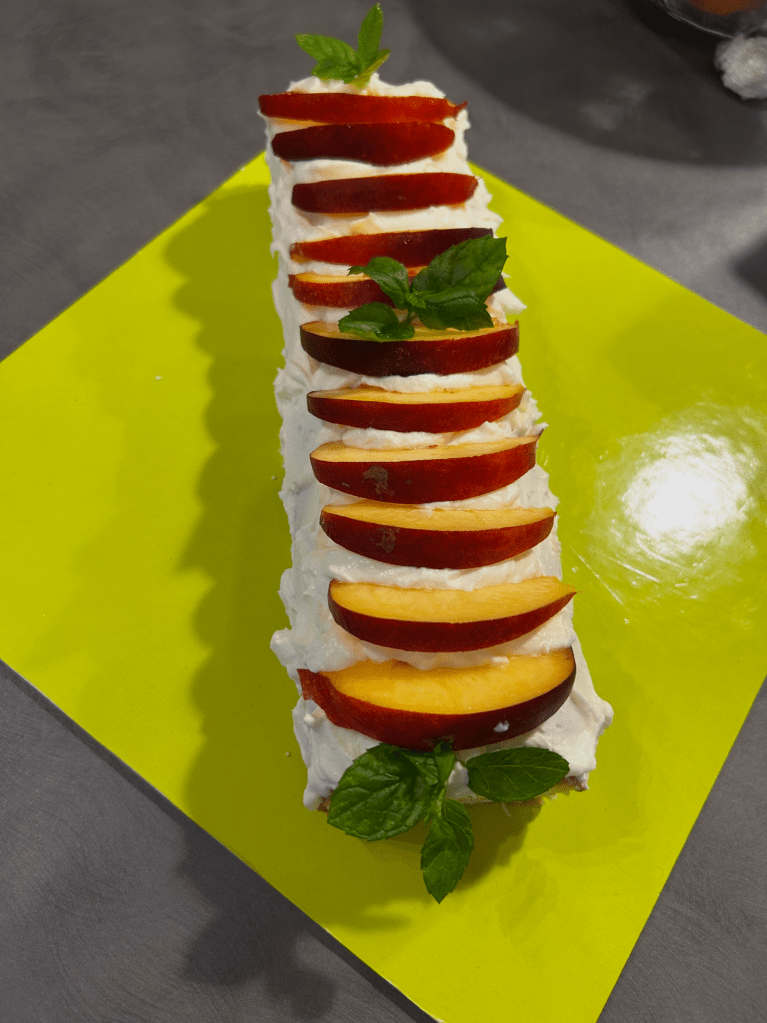 Con il rotolo alle pesche ho messo all’interno le pesche a pezzetti con la confettura di pesche e sopra delle fettine