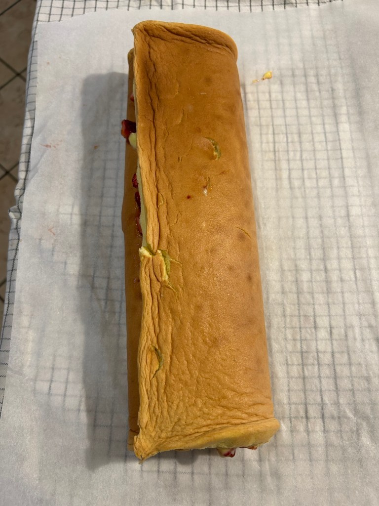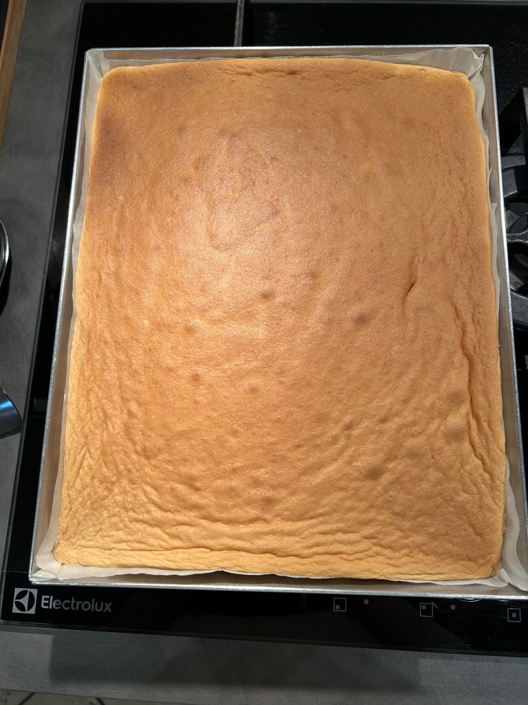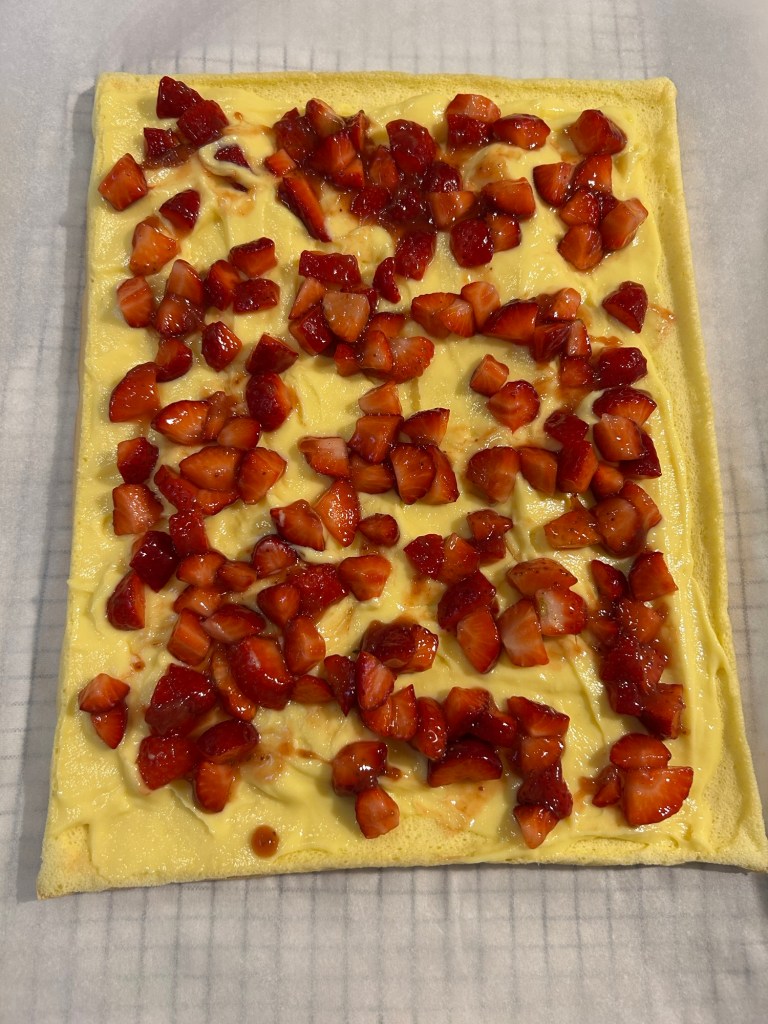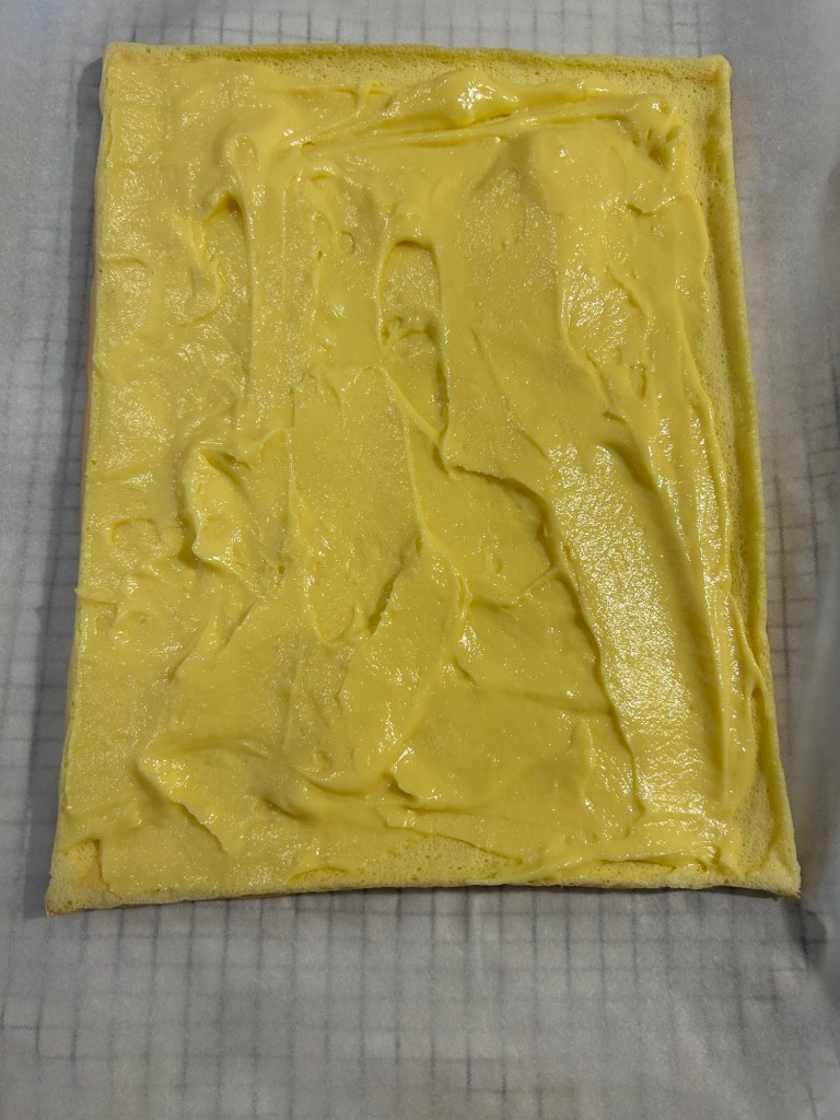 Copro con pellicola e aspetto che si raffreddi, poi tolgo la carta forno e la rovescio su un foglio di carta forno pulito sarà morbidissimo si arrotola senza rompersi, quindi farcitelo a piacere, io l’ho farcito con crema pasticcera la ricetta la trovate nel blog