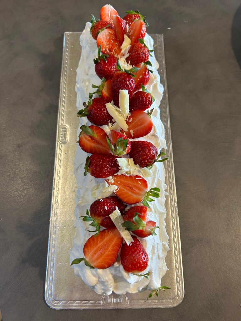 Monto della panna fresca leggermente addolcita con zucchero a velo, la distribuisco con una spatola in modo irregolare e decoro con fragole fresche e qualche scaglia di cioccolato bianco