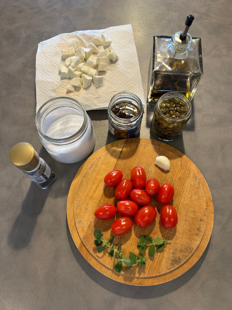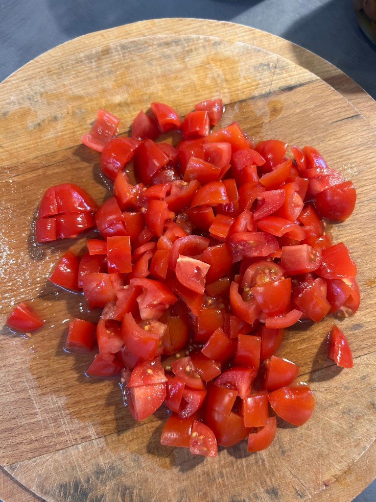 Taglio la mozzarella in cubetti e la metto ad asciugare su carta assorbente, lavo e taglio i pomodorini a cubetti