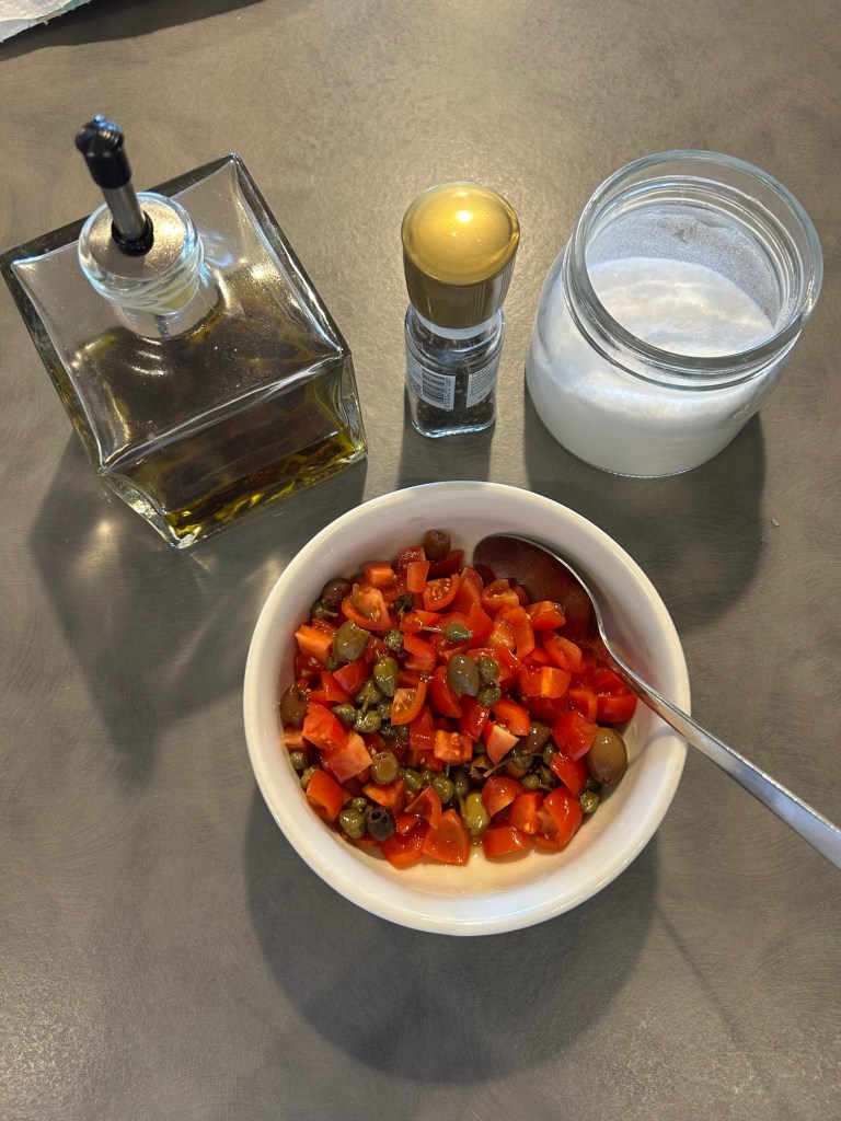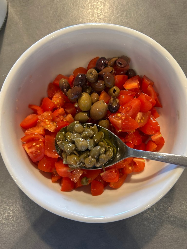 Li verso in una ciotola e aggiungo un cucchiaio di capperi e uno di olive