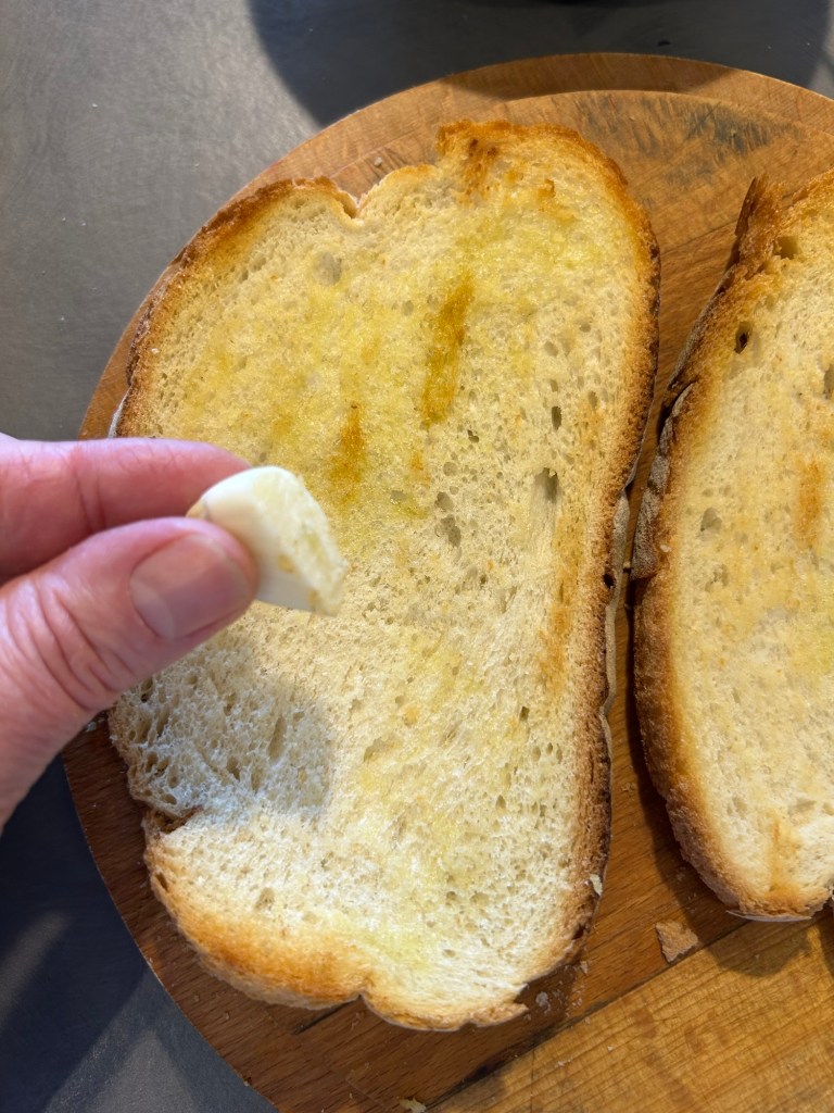Faccio bruschettare le fette di pane leggermente unte di olio su una griglia ben calda devono essere belle croccanti
