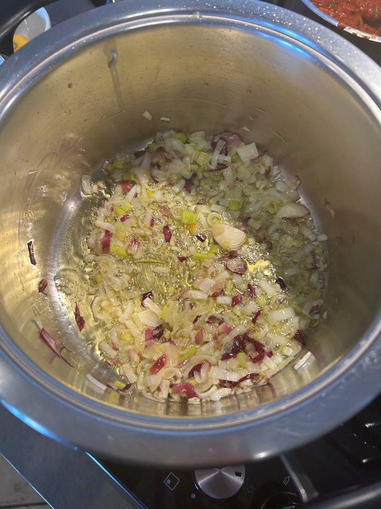 Lavo accuratamente le lenticchie in acqua corrente poi le scolo, trito il cipollotto e lo metto in una pentola capiente con olio e lascio soffriggere qualche minuto