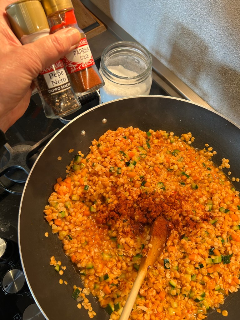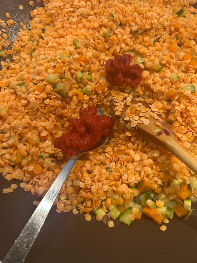 Aggiungo poca acqua calda e lascio per 5 minuti poi aggiungo le lenticchie e il concentrato di pomodoro