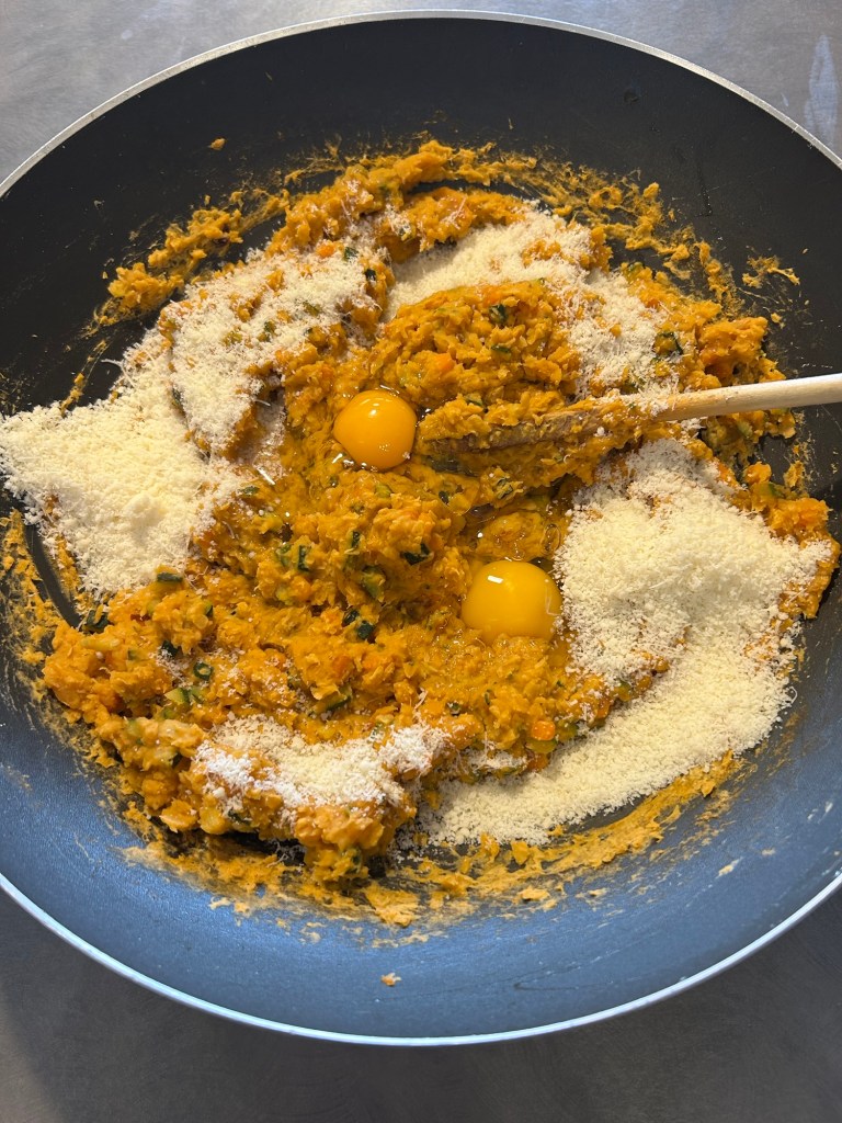 Lascio raffreddare il composto poi aggiungo le uova, il formaggio grattugiato mescolo