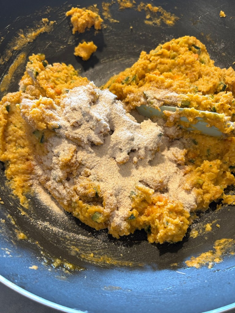 Aggiungo il pane grattugiato, bisogna ottenere un composto un composto piuttosto asciutto ma non duro, quindi il pane grattugiato va valutato secondo la consistenza del composto