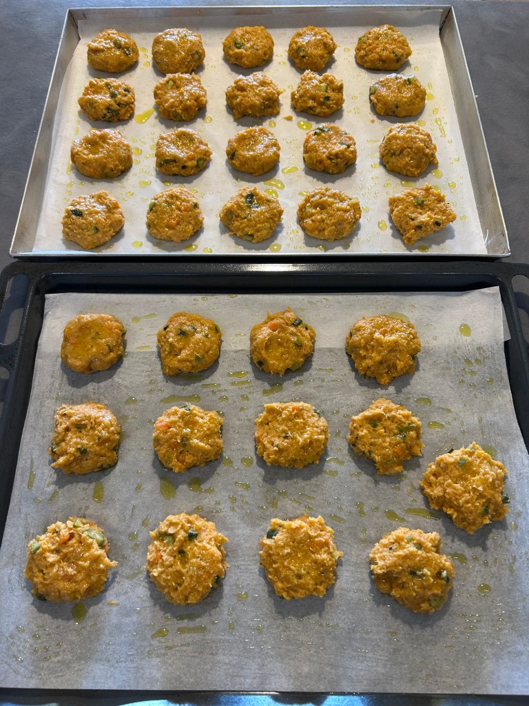 Mi ungo le mani e preparo delle polpettine leggermente schiacciate che appoggio su una teglia ricoperta di carta forno unta di olio, ne ho ottenute 33, le spruzzo di olio