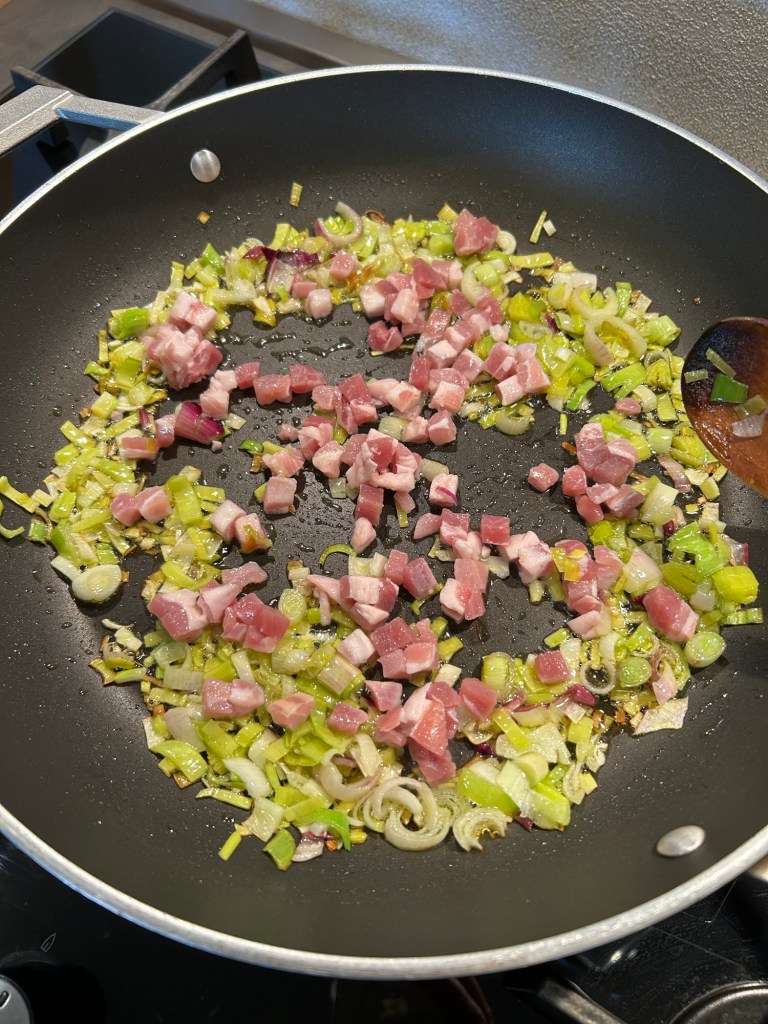 Lavo il porro e lo taglio sottilmente, lo lascio soffriggere in padella con un goccio di olio e la pancetta