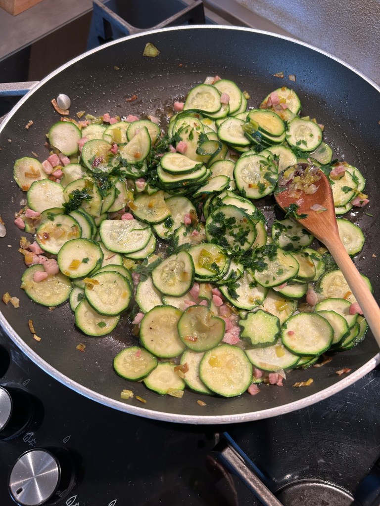 Dopo 5 minuti aggiungo le zucchine che ho affettato con la mandolina, porto a cottura lasciandole comunque un po’ croccanti, regolo di sale pepe e aggiungo un trito di prezzemolo, spengo il fuoco e lascio raffreddare