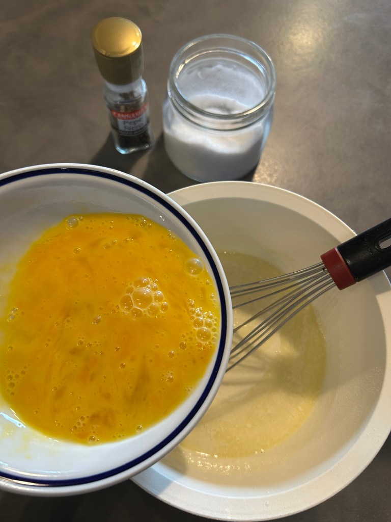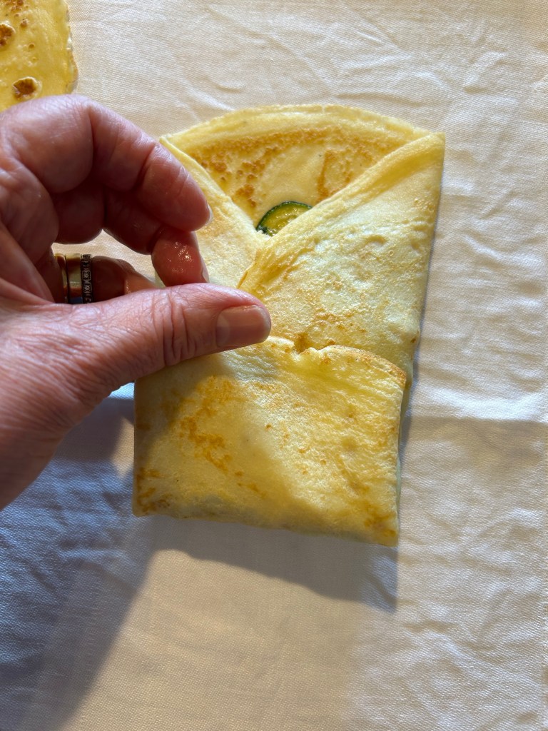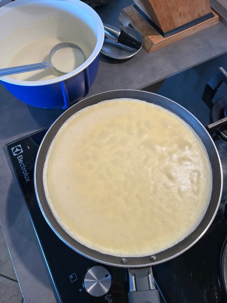 Preparo la pastella nella maniera classica, mescolo la farina setacciata con il latte, il burro fuso, aggiungo le uova, sale e pepe, e sbatto bene con la frusta per eliminare eventuali grumi, deve risultare una pastella liscia, se non lo fosse potete passarla al setaccio, la copro e la lascio riposare per una mezz’ora