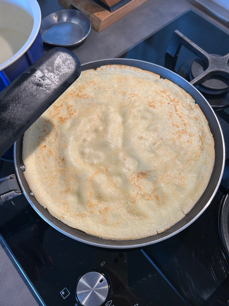 Preparo le crespelle, ungo con poco burro un pentolino per crespelle antiaderente e verso 2 mestolini sì pastella, faccio roteare la padella per distribuire il composto uniformemente e quando inizia a fare delle bollicine