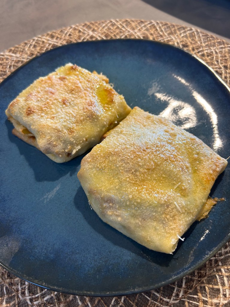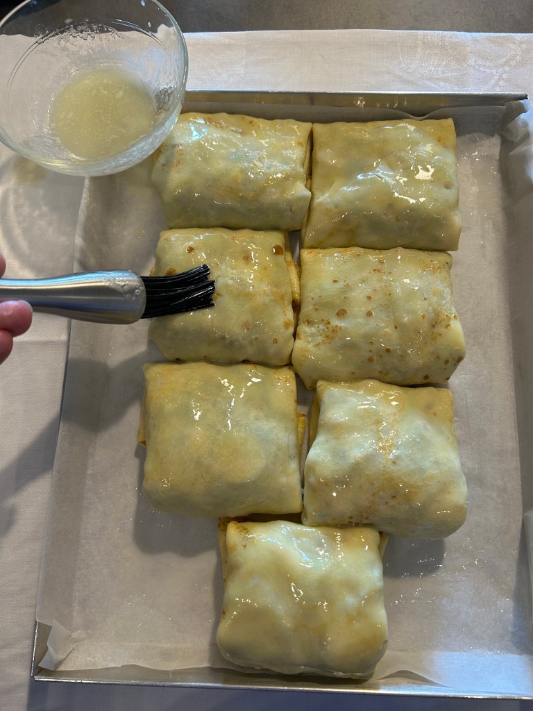 Chiudo a fagottino e li appoggio in una teglia ricoperta di carta forno unta di burro, spennello anche i fagottini di burro, se volete adesso potete aggiungere la besciamella