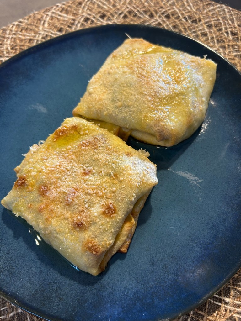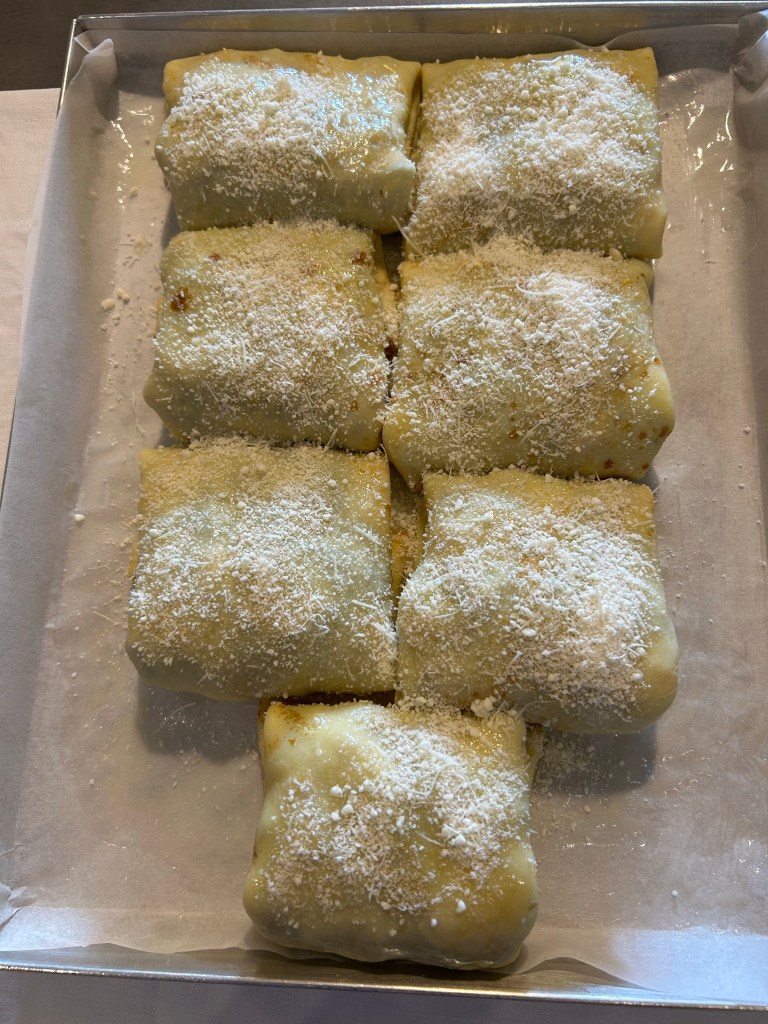 Cospargo di parmigiano grattugiato e inforno a 180 gradi per circa mezz’ora finché diventano dorati