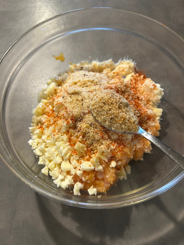 In una ciotola verso il pane grattugiato con il formaggio grattugiato
