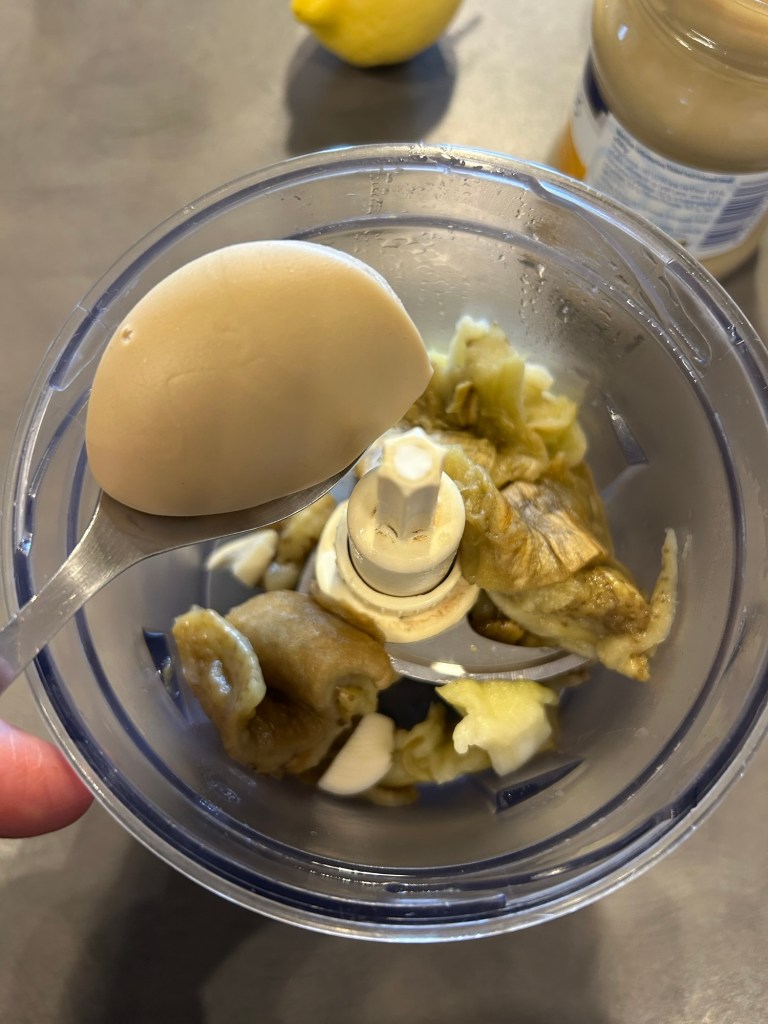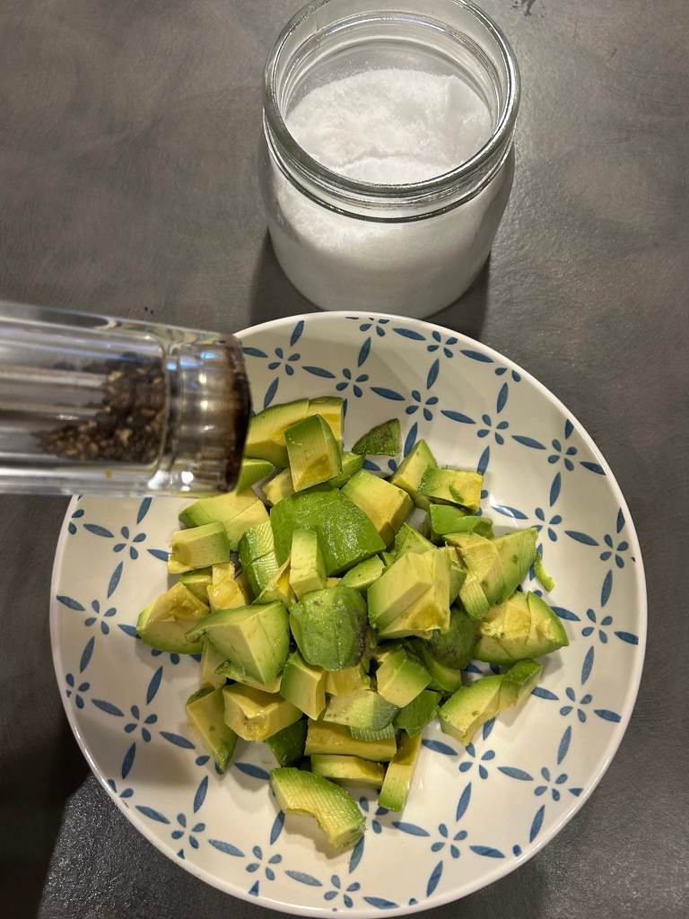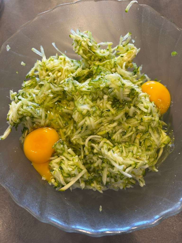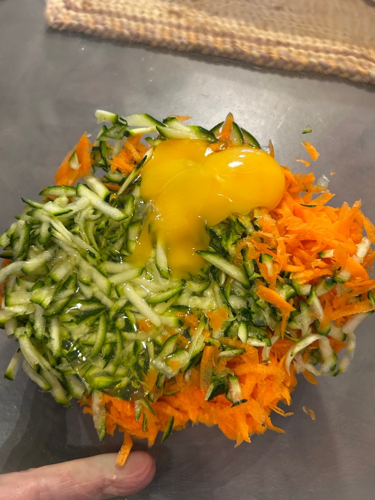 Unisco un uovo e un tuorlo, l’altro uovo e l’albume avanzato le utilizzo per la panatura, aggiungo sale e pepe