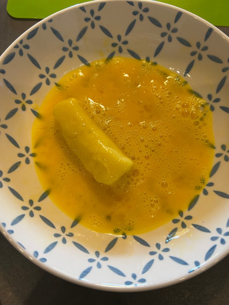 In una ciotola batto l’uovo e l’albume e metto le crocchette