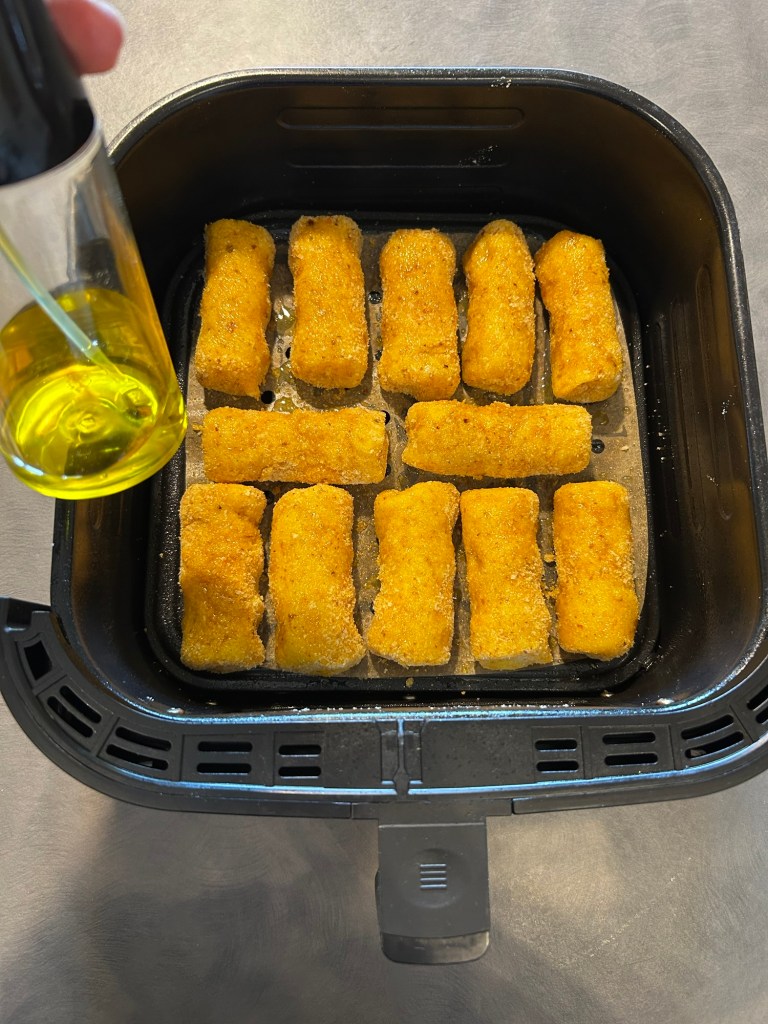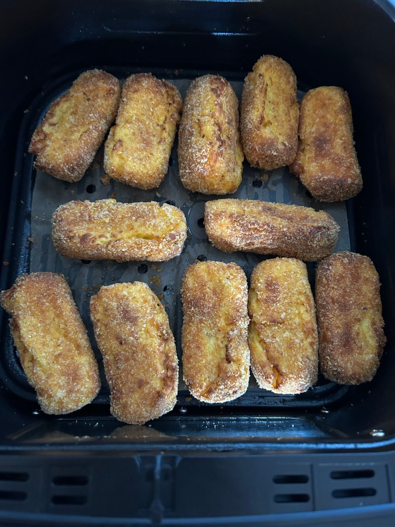 Dispongo le crocchette nel cestello della friggitrice con sotto un foglio di carta forno forato, spruzzo le crocchette con olio e inforno a 170 gradi per circa 20 minuti, devono dorare, oppure potete friggerle in olio di arachidi a 180 gradi