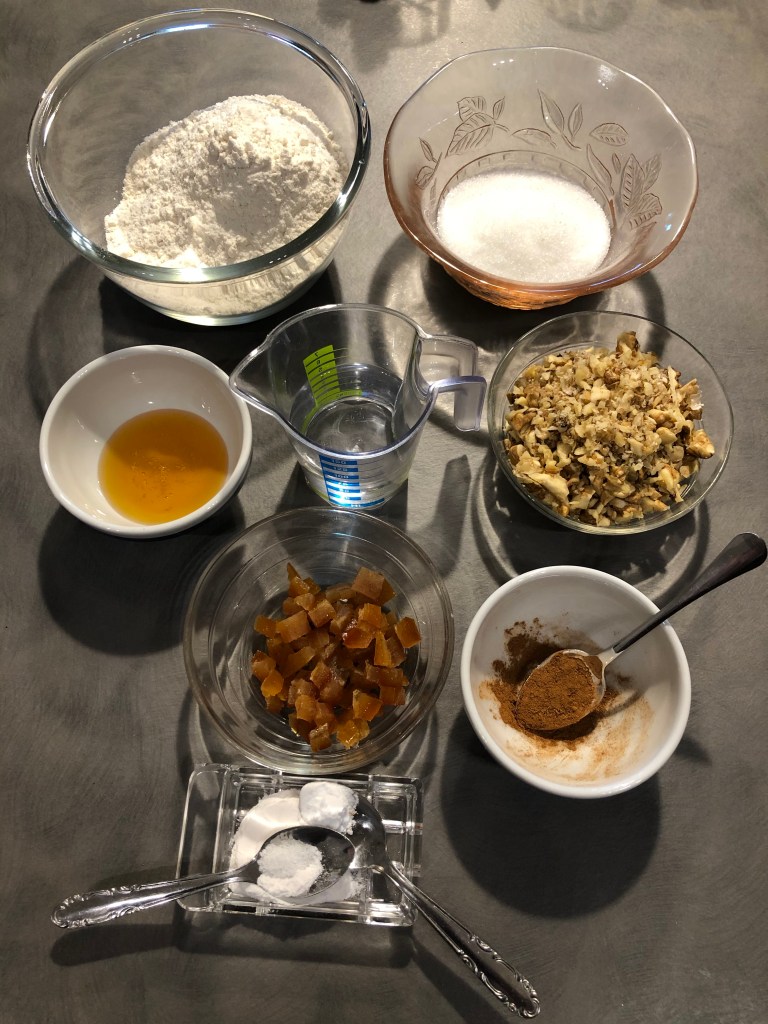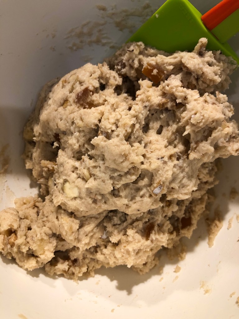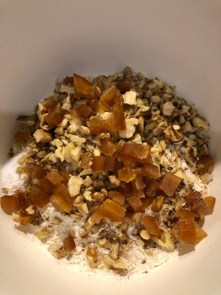 Aggiungo le noci tritate e l’arancio candito a cubetti e mescolo