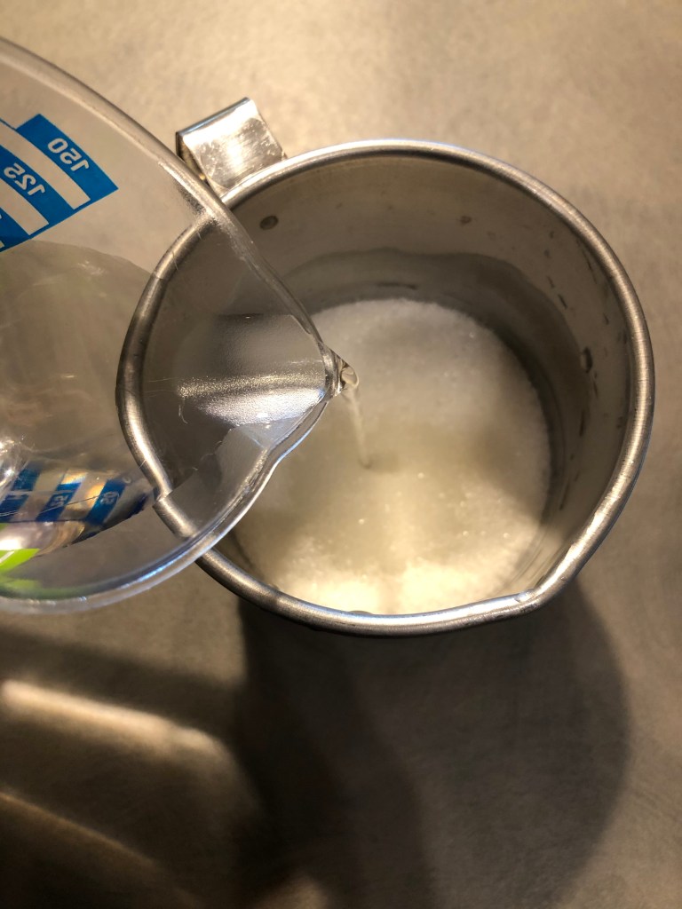 In un pentolino verso l’acqua e lo zucchero, e li sciolgo sul fuoco, preparo uno sciroppo non deve caramellare, solo sciogliere