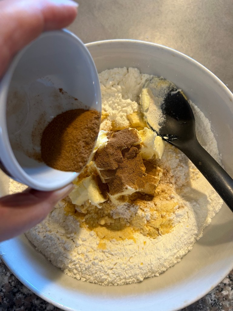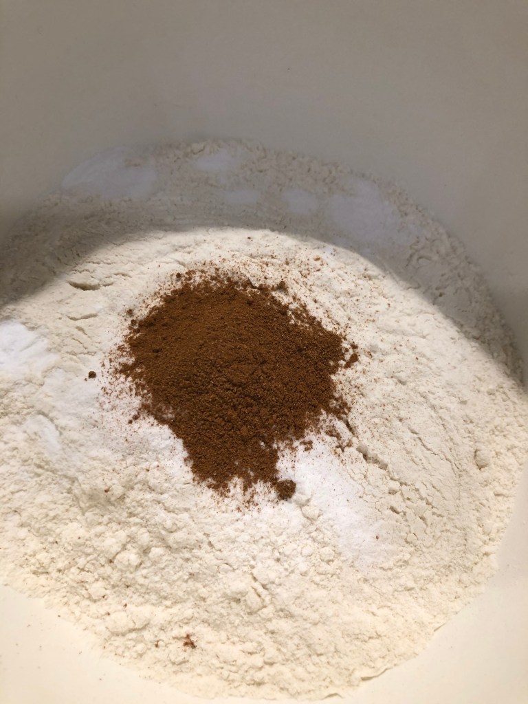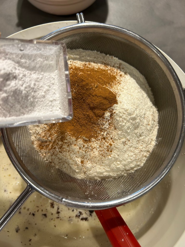 Setaccio farina, lievito e un cucchiaino di cannella e li aggiungo alle uova