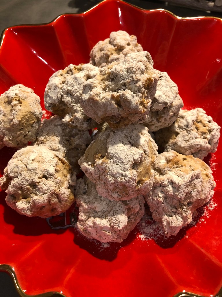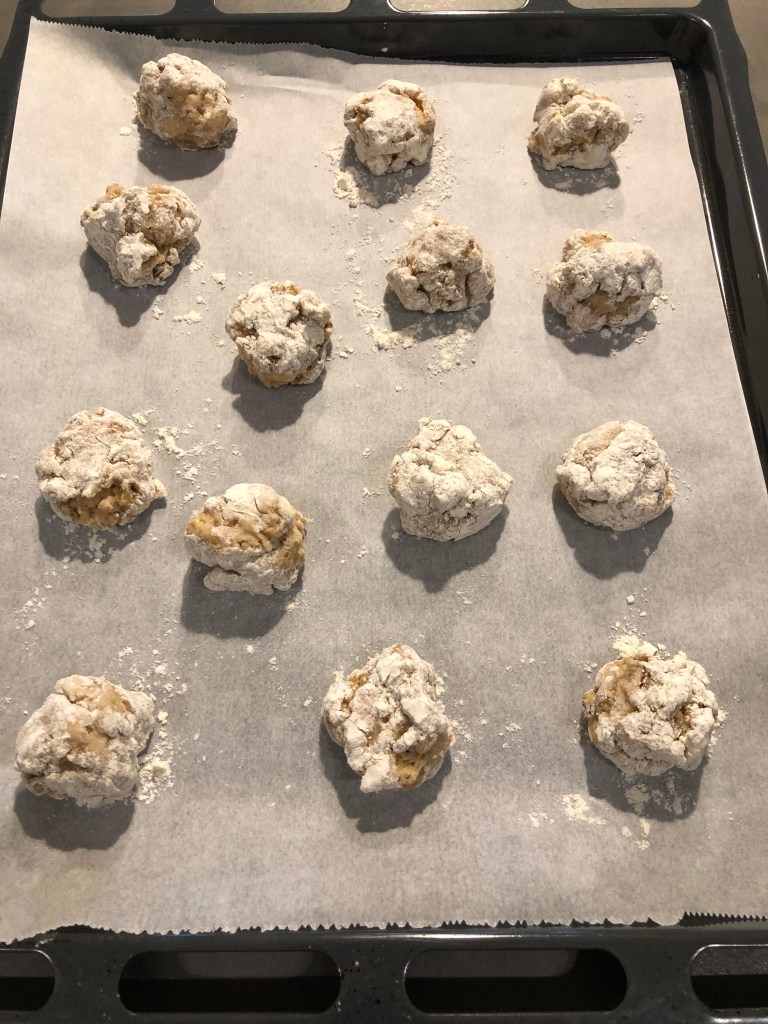 Passo nello zucchero a velo, la ricetta originale prevede di passarli nella farina ma io li preferisco nello zucchero a velo e li appoggio sulla carta forno