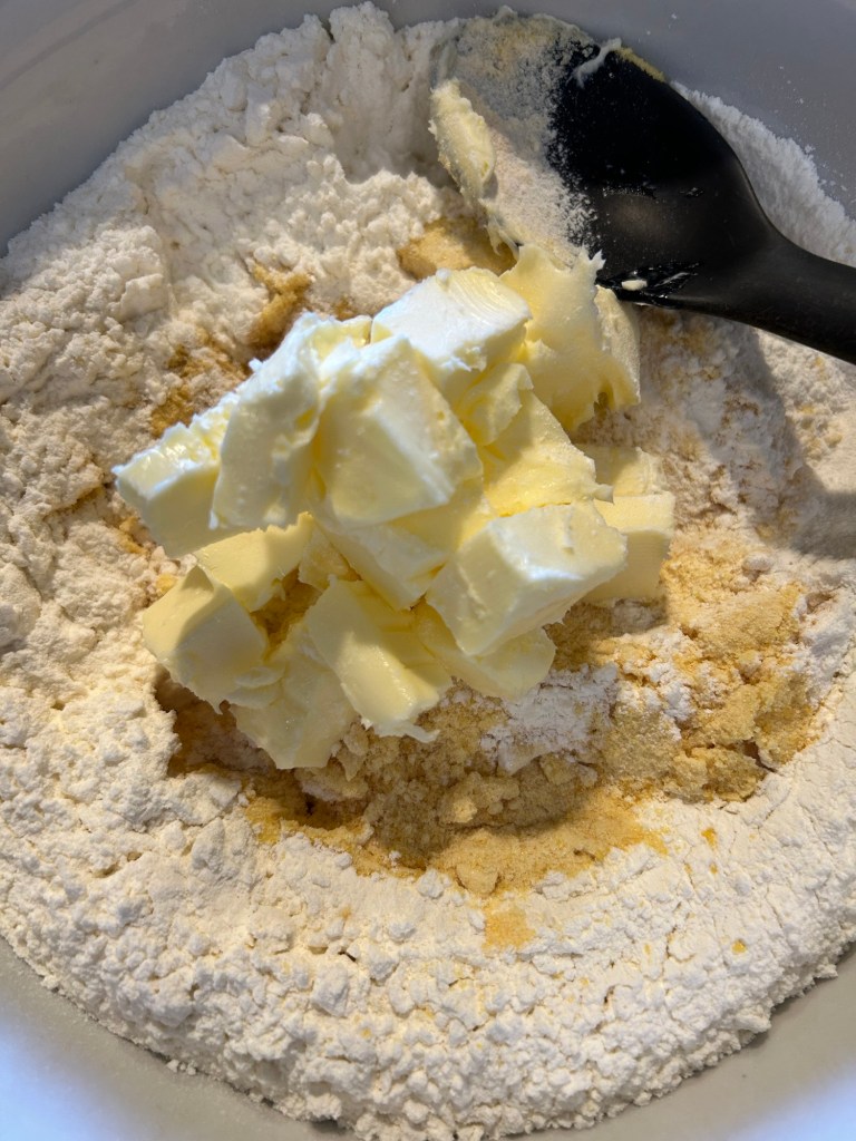 Tolgo 10 minuti prima il burro dal frigorifero e lo taglio a pezzetti, io ho utilizzato la planetaria ma potete farla anche a mano, metto il burro, lo zucchero e un pizzico di sale nella ciotola