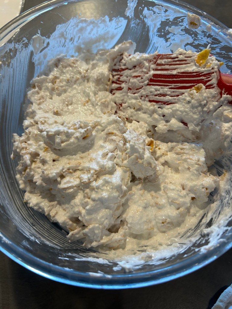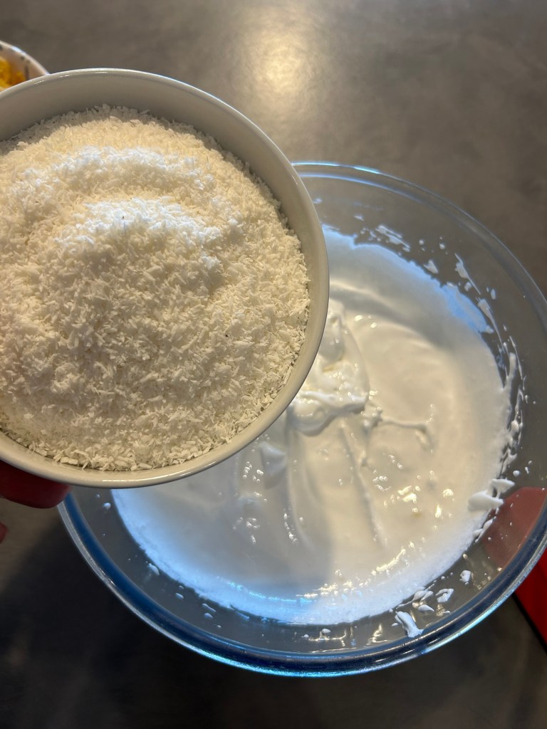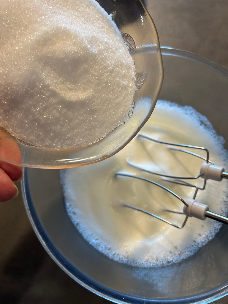 In una ciotola monto gli albumi, quando iniziano a gonfiarsi unisco poco per volta lo zucchero continuando a lavorare con le fruste