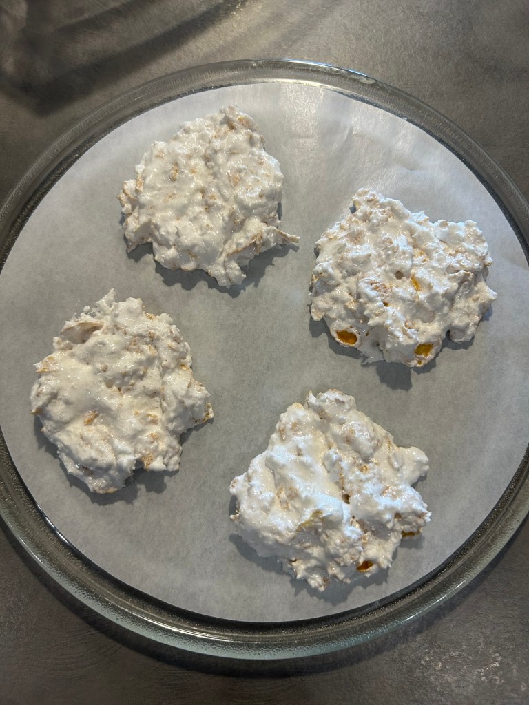 Prendo il piatto del microonde deve essere girevole lo rivesto di carta forno e appoggio 4 mucchietti di impasto ben distanziati perché in cottura di allargano