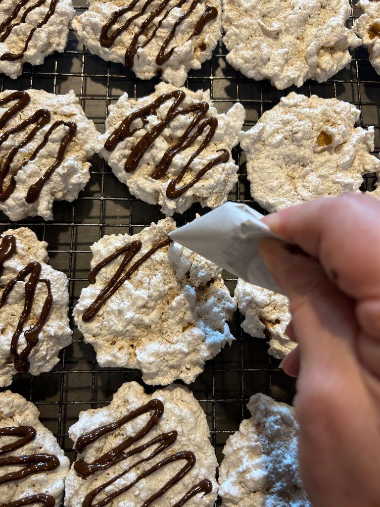 Metto il cioccolato in un cornetto di carta forno e faccio delle righe sulla superficie dei biscotti