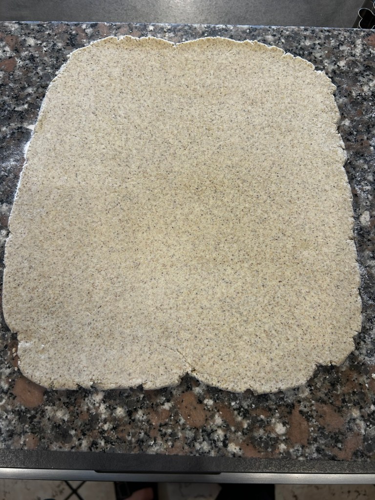 Al momento dell’ utilizzo infarino il piano di lavoro e tiro la sfoglia con il matterello in uno spessore di 4 mm