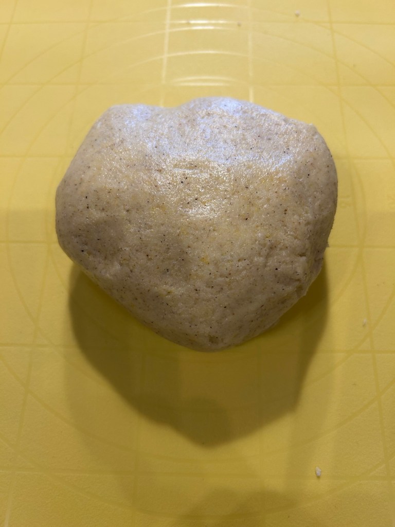 Mi trasferisco sul piano di lavoro e impasto fino ad ottenere un panetto, aggiungo poco per volta l’acqua, forse ne servirà ancora un goccio o meno, dipenderà dal grado di assorbimento della farina