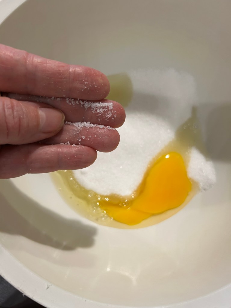 In una ciotola metto uova, zucchero e un pizzico di sale
