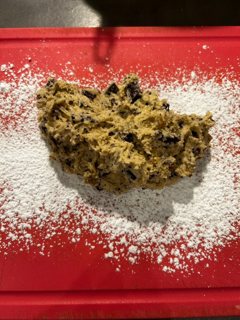 Spolverizzo il piano di lavoro con zucchero a velo, suddivido il composto in 4 parti, trasferisco la prima parte sullo zucchero